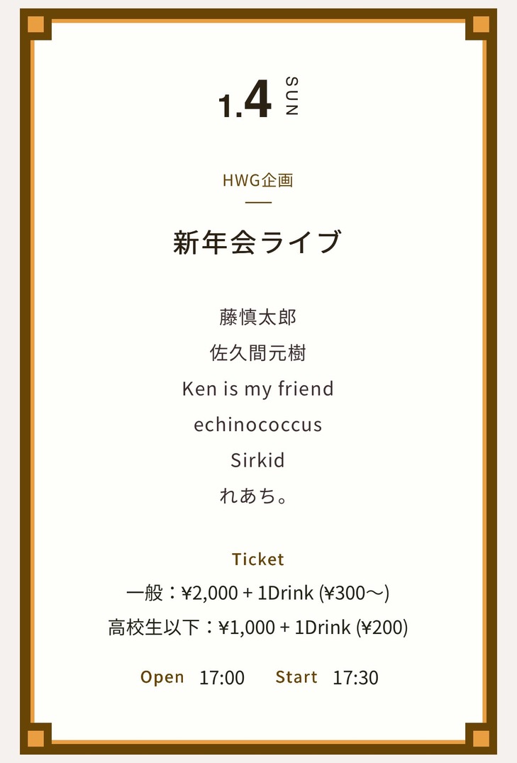 一般:¥2,000 + 1Drink (¥300〜) 高校生以下:¥1000 + 1Drink (¥200)